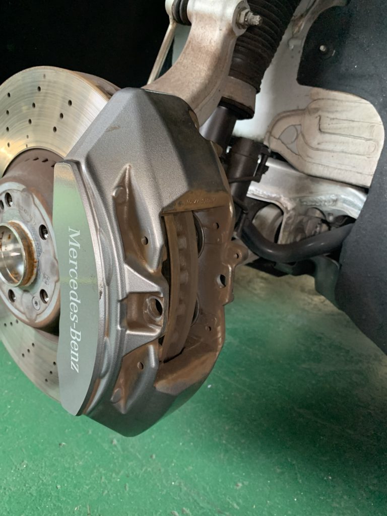 コチラの写真はメルセデスベンツのブレーキパッド交換中の写真です